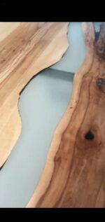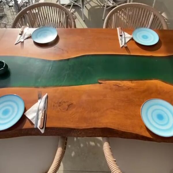 A perfect add on Furniture piece of art, the Dining table made by adding Terquaze Epoxy Resin River shape filled by the Ultimate protection and shine solutions, Epoxy Resin, fine solid wood main construction, long life and anti-scratch.